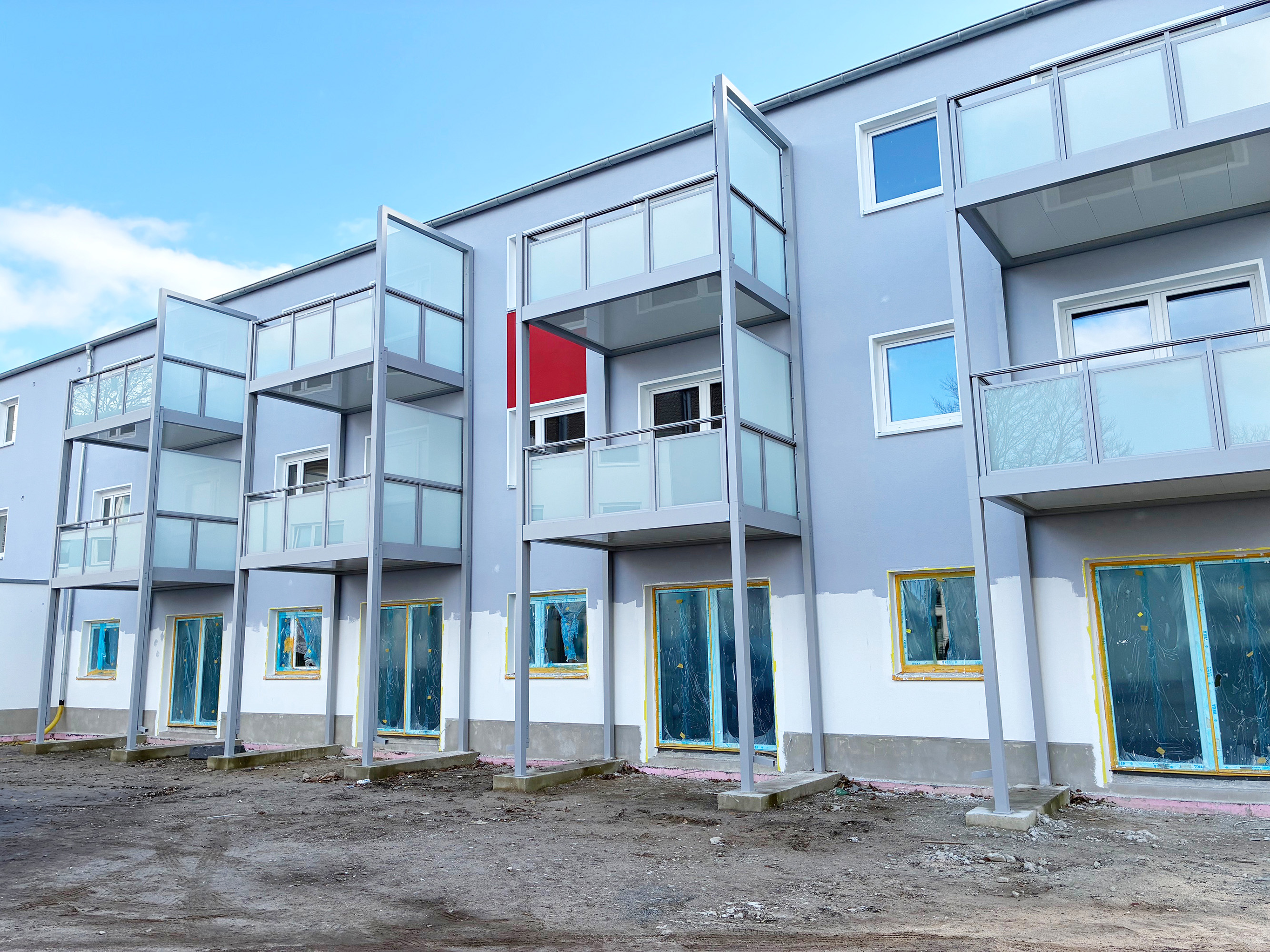 Die Wohnanlagen erstrecken sich über drei Geschosse und überzeugen durch zeitgemäße Architektur sowie funktionale Grundrisse. Die Wohnungen sind ebenerdig oder über außenliegende Galeriegänge zugänglich. Jede Einheit verfügt über einen Balkon oder eine Terrasse. Ein Personenaufzug sorgt für Barrierefreiheit. Abstellräume und 17 PKW-Stellplätze runden das Angebot ab.