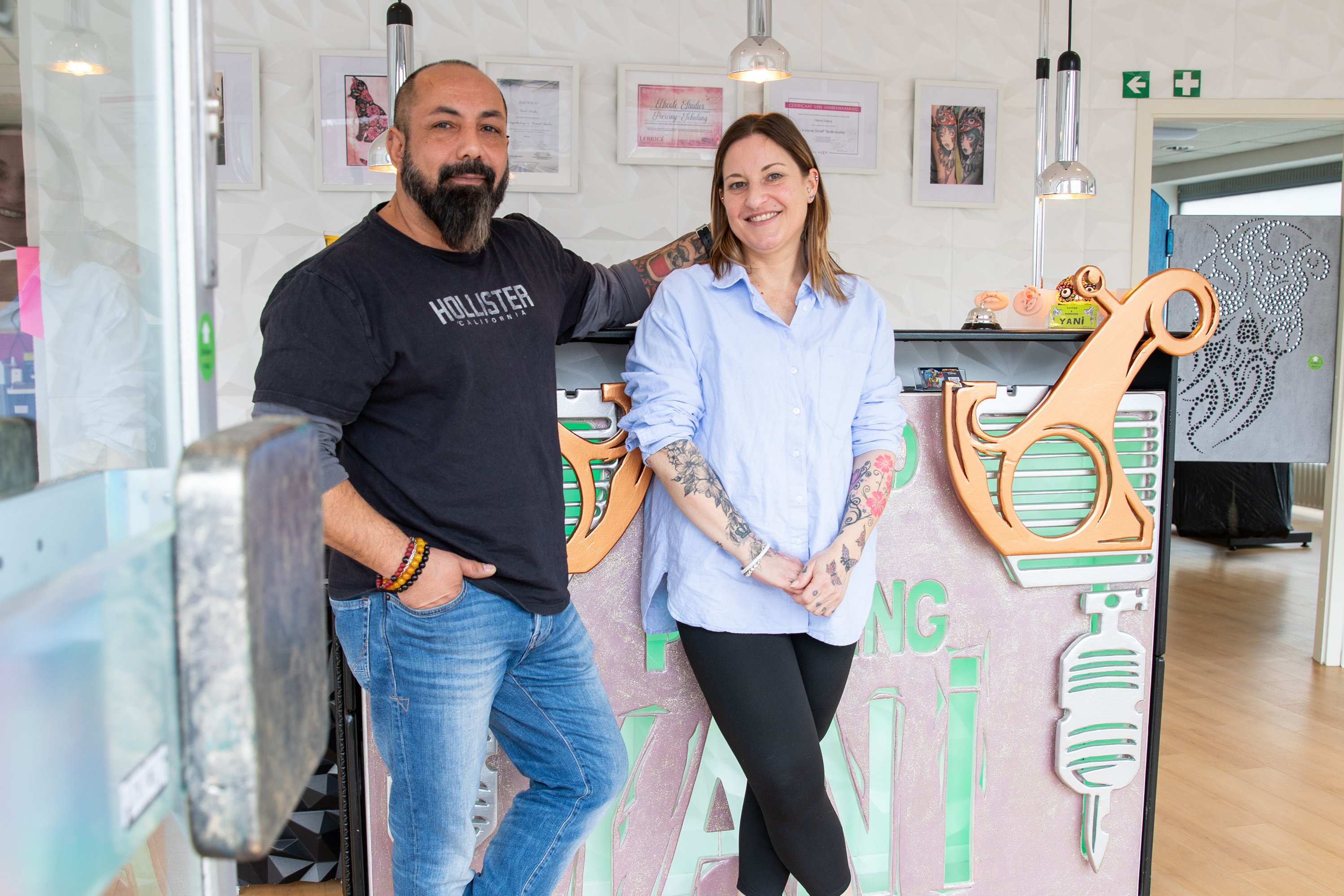 Die Begeisterung für Körperschmuck teilt ihr Lebensgefährte Yalin, wenn auch auf andere Weise. Schon als Jugendlicher brachte er sich selbst das Tätowieren bei. „Es war schon immer mein Traum, ein eigenes Studio zu haben“, erzählt der gebürtige Türke, der mit Nicole in der Gartenstadt lebt. Die war sofort Feuer und Flamme für seine Idee. Sie besuchte Piercingkurse, kündigte ihren Job und machte mit – eine Erbschaft erleichterte die Investition. „Am 1. September 2024 haben wir über die WOBAU die Räume gefunden und am 16. November unter dem Namen YANI – einer Verschmelzung unserer Vornamen – eröffnet“, erklärt Nicole. Die Raumaufteilung passte perfekt, große Umbauten waren nicht nötig.